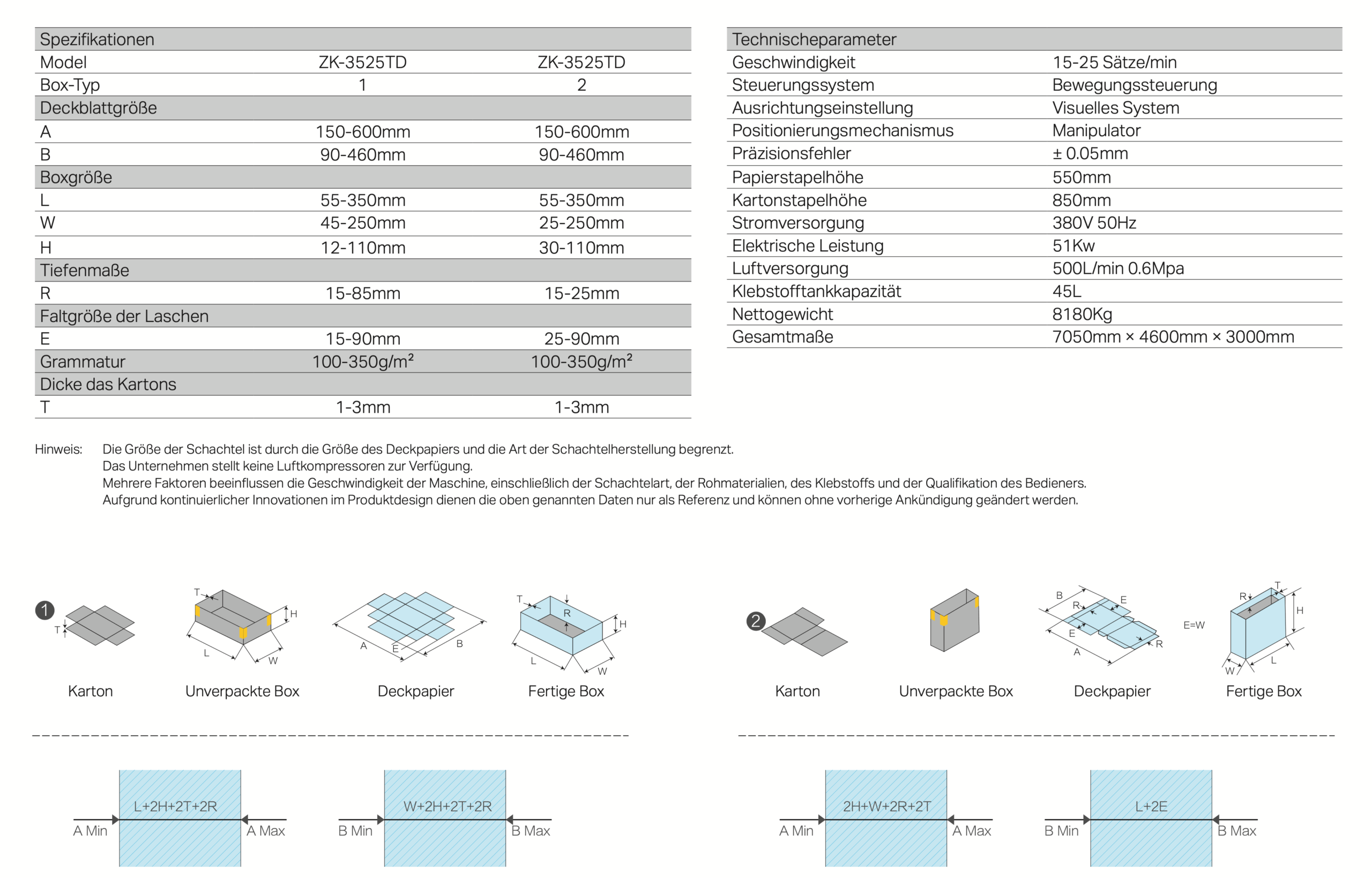 Die ZK-3525TD ist speziell für die parallele Produktion von Unter- und Oberteil in einem einzigen Arbeitsschritt konzipiert. Sie erreicht eine Leistung von bis zu 25 Verpackungssätzen pro Minute. Verarbeitet werden Formate bis 350 × 250 mm bei Schachtelhöhen bis 110 mm. Die Maschine nutzt ein visuelles Positioniersystem mit Manipulator und erzielt eine Genauigkeit von ±0,05 mm. Ideal für standardisierte Verpackungsprozesse mit hoher Effizienz.