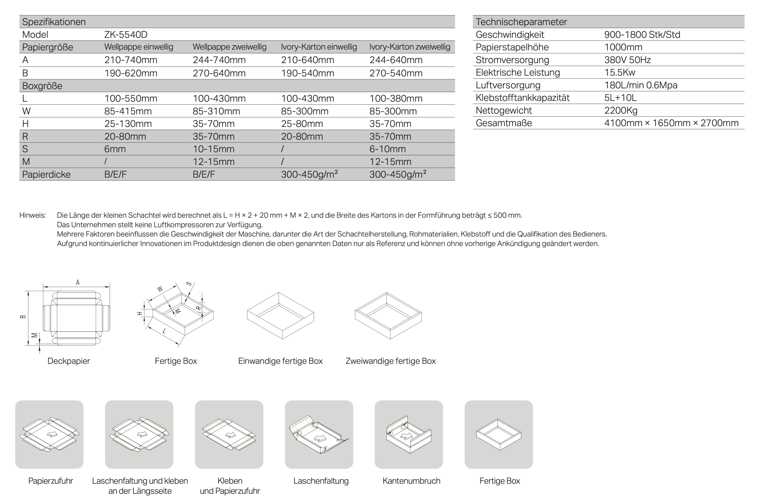 Die ZK-5540D ist eine hochflexible Lösung für die Verarbeitung von Wellpappe (ein- oder zweiwellig) sowie Kartonmaterialien. Sie formt Verpackungen mit Längen bis 550 mm und Höhen bis 130 mm bei einer Geschwindigkeit von bis zu 1800 Stück pro Stunde. Dank ihrer robusten Bauweise, zwei Klebstofftanks und hoher Anpassungsfähigkeit eignet sich die Maschine perfekt für Produktionen mit wechselnden Anforderungen – von einwandigen bis zu zweiwandigen Faltschachteln.