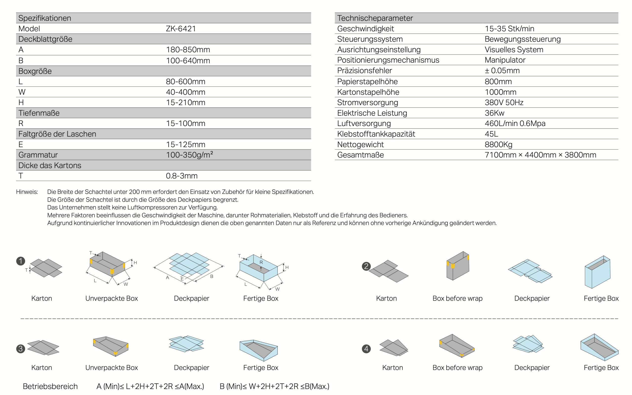 Die ZK-6421 ermöglicht die Herstellung von Verpackungen mit Schachtelhöhen bis zu 210mm. Sie verarbeitet Formate bis 600 x 400mm bei einer Leistung von bis zu 25 Verpackungssätzen pro Minute. Die visuelle Ausrichtung und ein Manipulator sorgen für eine präzise Positionierung mit einer Toleranz von ±0,05mm. Ideal für großvolumige Verpackungslösungen.