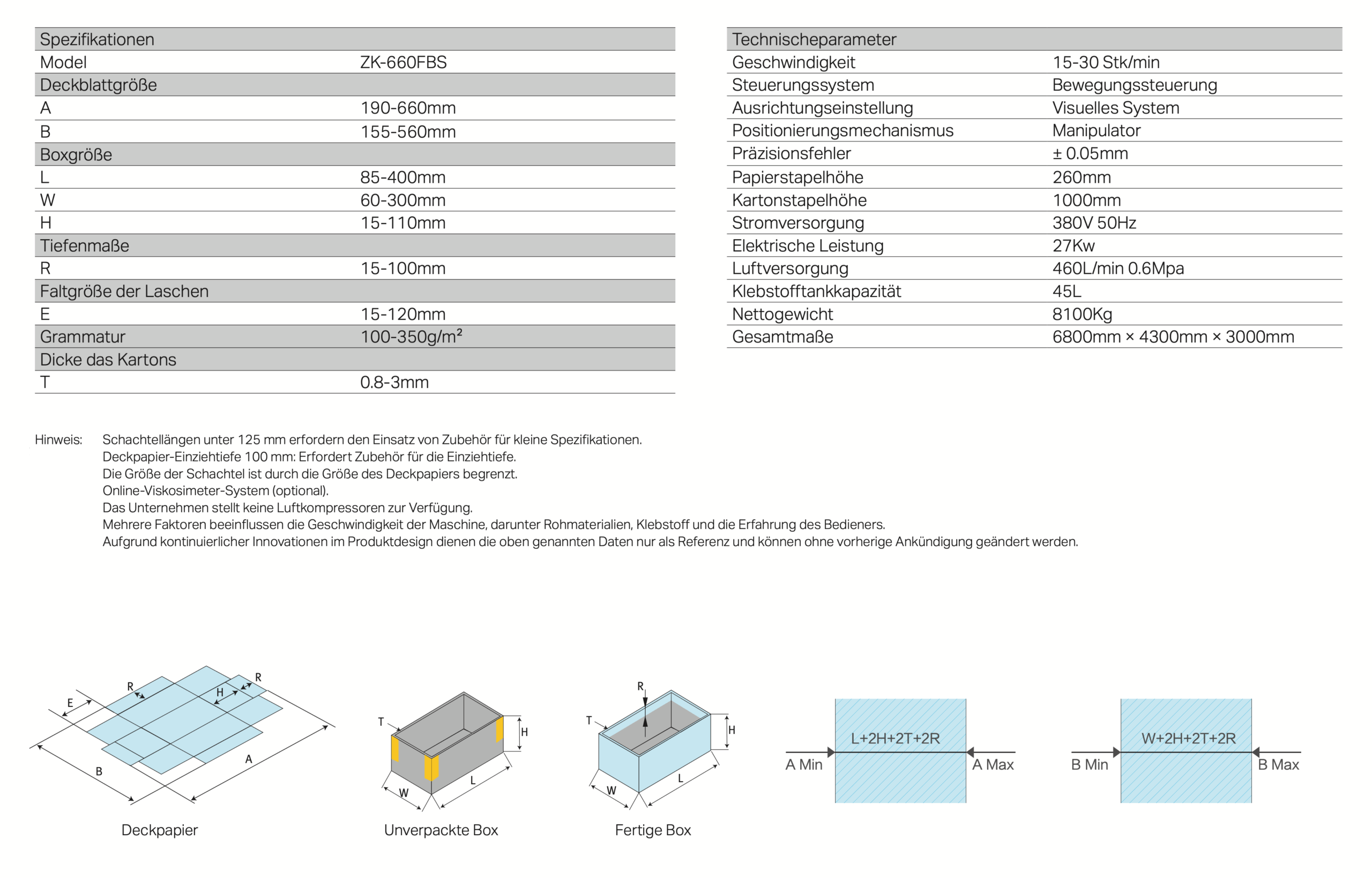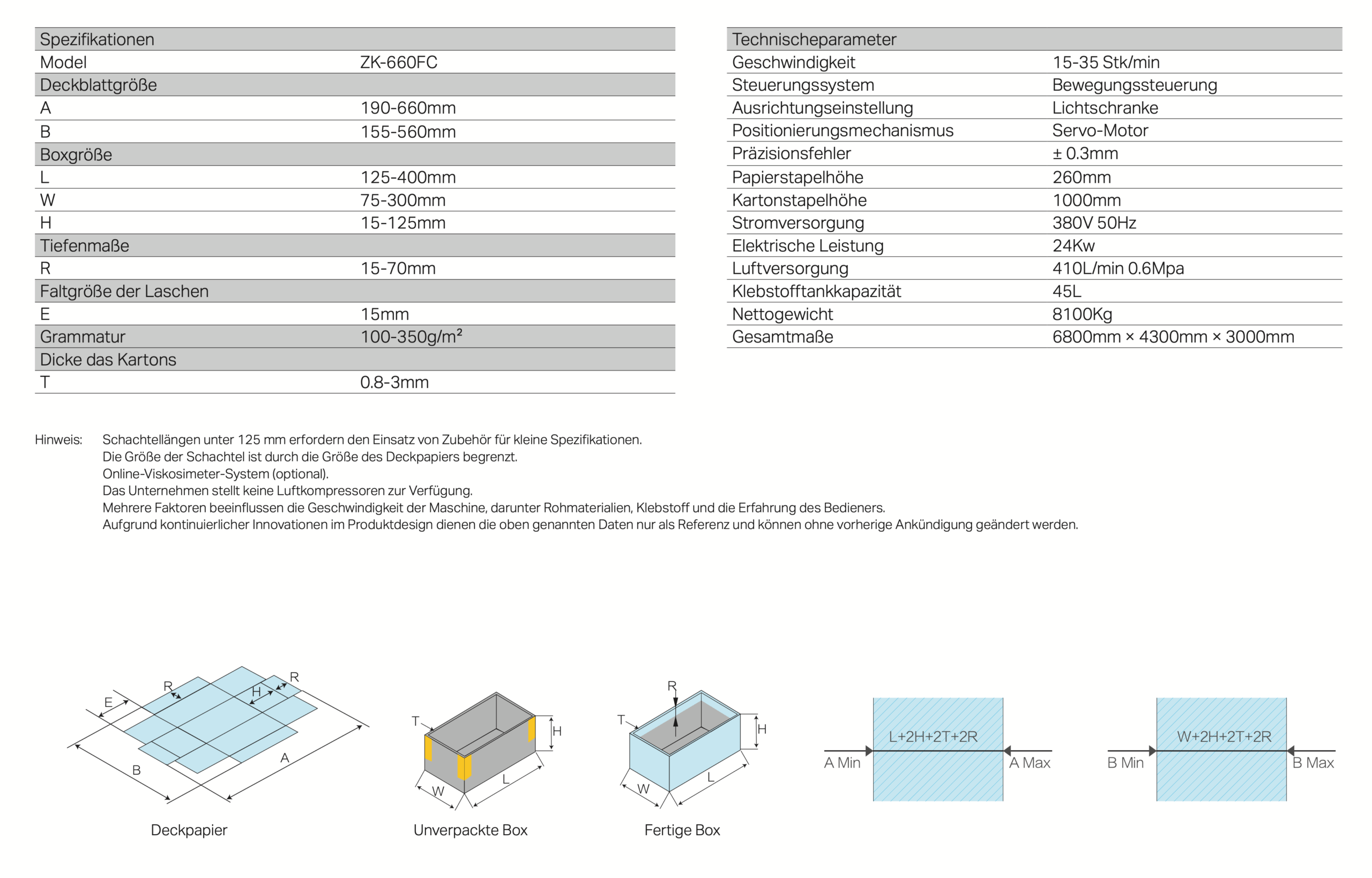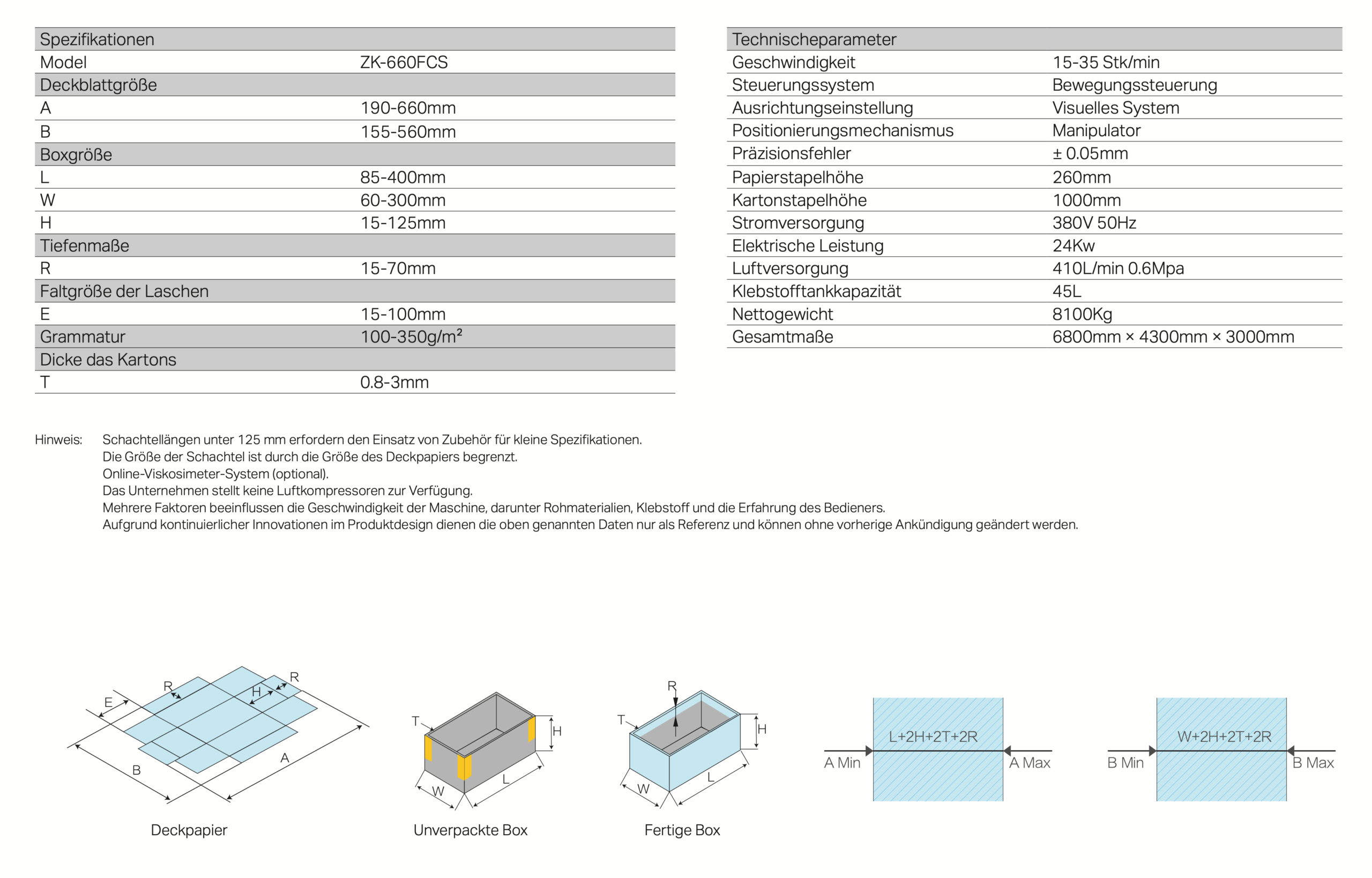Die ZK-660FCS ist für Formate bis 400 × 300 mm und Schachtelhöhen bis 125 mm ausgelegt. Sie arbeitet mit einer Geschwindigkeit von 15–35 Stück pro Minute. Das visuelle Ausrichtungssystem mit Manipulator bietet eine hohe Positioniergenauigkeit von ±0,05 mm. Die Maschine eignet sich für präzise Anwendungen mit wirtschaftlicher Ausrichtung.