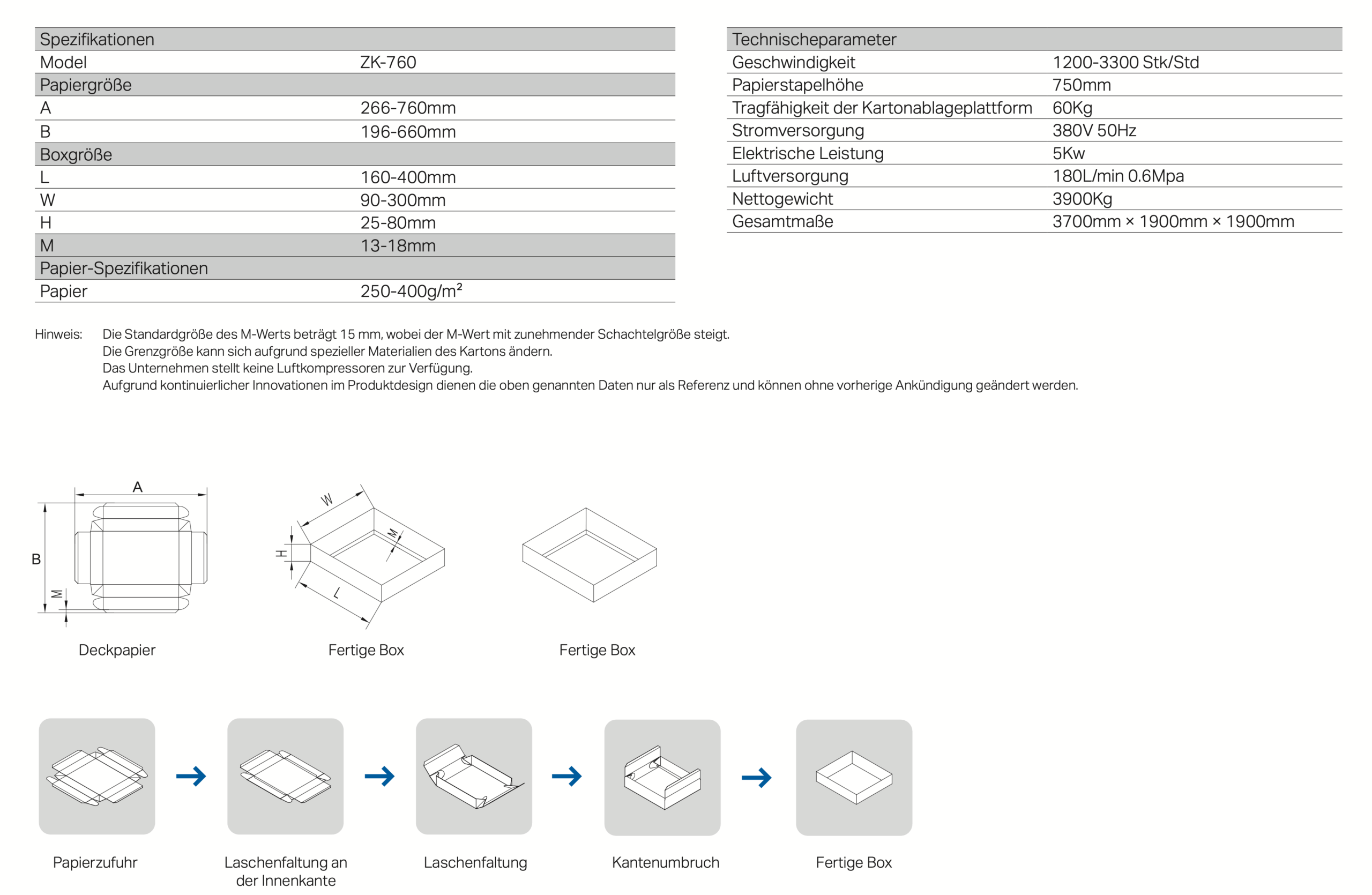 Die ZK-760 ist eine umweltfreundliche Faltschachtelmaschine, die vollständig ohne Klebstoff arbeitet. Mit einer beeindruckenden Leistung von bis zu 3300 Stück pro Stunde verarbeitet sie Formate bis 760 × 660 mm. Sie eignet sich für Boxhöhen von 25–80 mm und überzeugt durch ihre kompakte Mechanik, geringe Betriebskosten und eine besonders lange Lebensdauer. Ideal für nachhaltige Produktionen mit hohen Anforderungen an Tempo und Stabilität.
