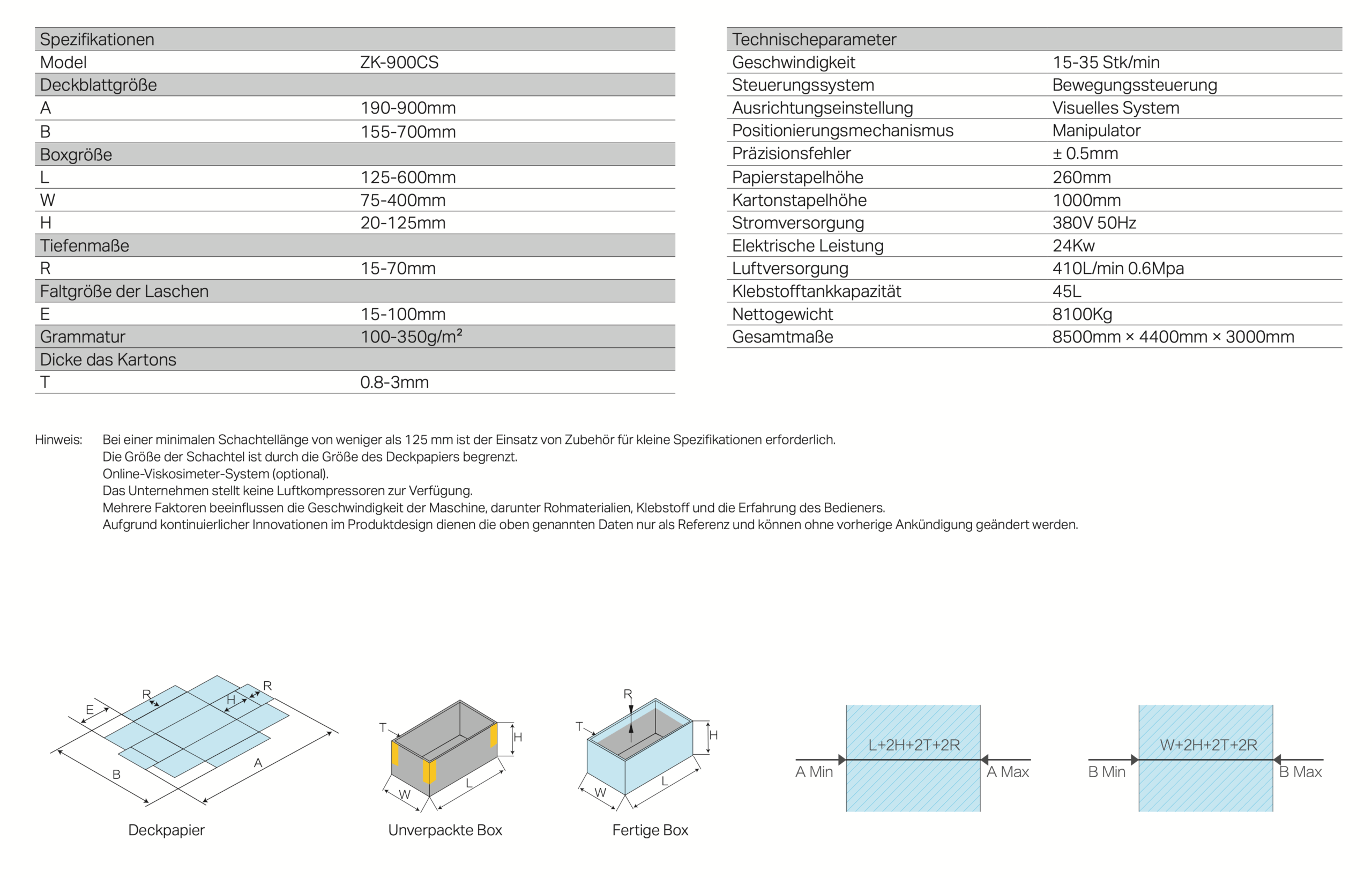 Die ZK-900C verarbeitet Formate bis 600 × 400 mm bei Schachtelhöhen bis 125 mm. Sie erreicht 15–35 Stück pro Minute und nutzt ein Lichtschranken-basiertes Ausrichtungssystem mit Servomotor. Die Maschine ist auf große Verpackungseinheiten mit erhöhten Anforderungen an Stabilität und Format ausgelegt.