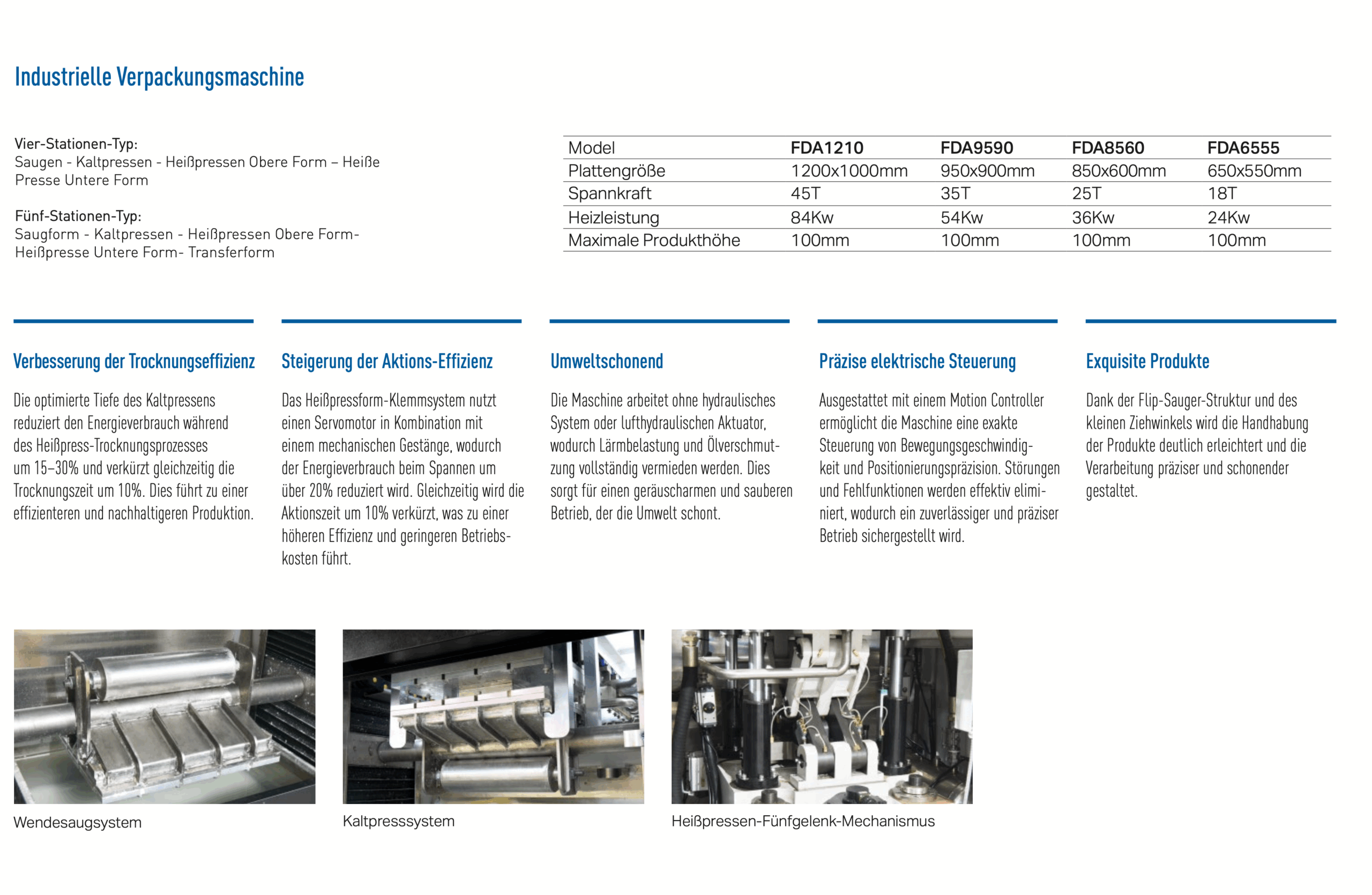 Die FDA-Serie erweitert die Vorteile der FD-Serie um zusätzliche Stationen für komplexere Formgebungen und höhere Taktzahlen. Mit bis zu fünf integrierten Stationen und optimierter Prozesssteuerung bietet die ZK-FDA höchste Präzision bei gleichzeitiger Energieeffizienz. Dank ihrer modularen Bauweise eignet sie sich besonders für anspruchsvolle Anwendungen, bei denen Qualität, Flexibilität und Nachhaltigkeit gleichermaßen gefordert sind.