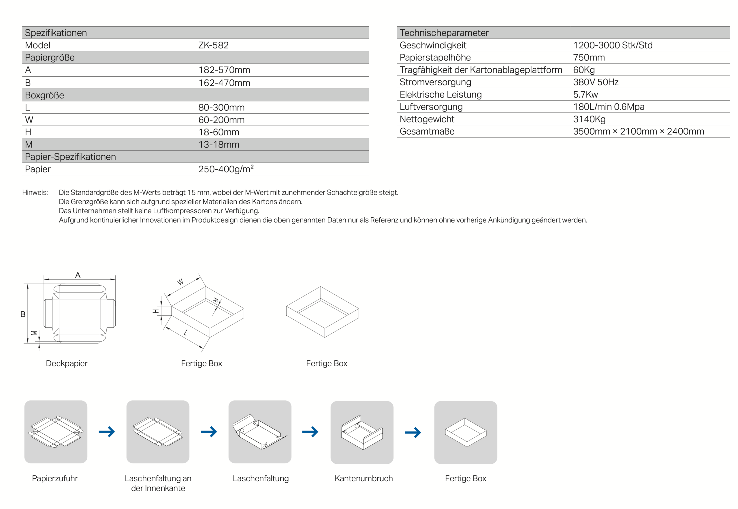 Die ZK-582 produziert Faltschachteln mit bis zu 3000 Stück pro Stunde. Sie verarbeitet Formate bis 570 × 470 mm bei Schachtelhöhen von 18–60 mm. Das mechanische Formsystem arbeitet ohne Klebstoff, spart Materialkosten und schont die Umwelt. Ideal für Betriebe mit mittlerem Formatbedarf und hohem Ausstoß.